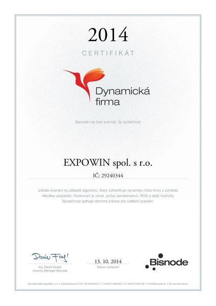 chceme Vám touto cestou poděkovat, protože především díky Vám a Vaší spokojenosti jsme získali ocenění „DYNAMICKÁ FIRMA“. Znamená to, že my - ExpoWin spol. s r. o., jsme důvěryhodná, zdravá firma,